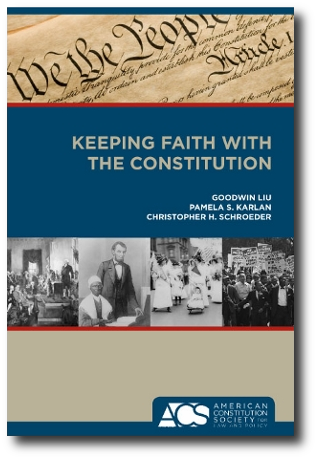 "Keeping Faith with the Constitution" is a new publication of the American Constitution Society that presents a compelling and common-sense approach to constitutional interpretation – one that is faithful to the Constitution’s words and principles and that explains why it is the world’s most enduring written constitution. The book, authored by scholars Goodwin Liu, Pamela S. Karlan, and Christopher H. Schroeder, examines the text and history of the Constitution to show how the Framers inscribed the fundamental values of liberty, equality, and democracy into the document. It then describes and defends an approach to interpreting the Constitution the authors call “constitutional fidelity,” which, as the Framers envisioned, applies the Constitution’s broad principles to the changing needs, conditions, and understandings of our society. This dynamic process of constitutional interpretation, the book shows, has brought about the greatest legal achievements in our history, has allowed us to meet new challenges and unforeseen circumstances, and has enabled each generation of Americans to keep faith with the Constitution.